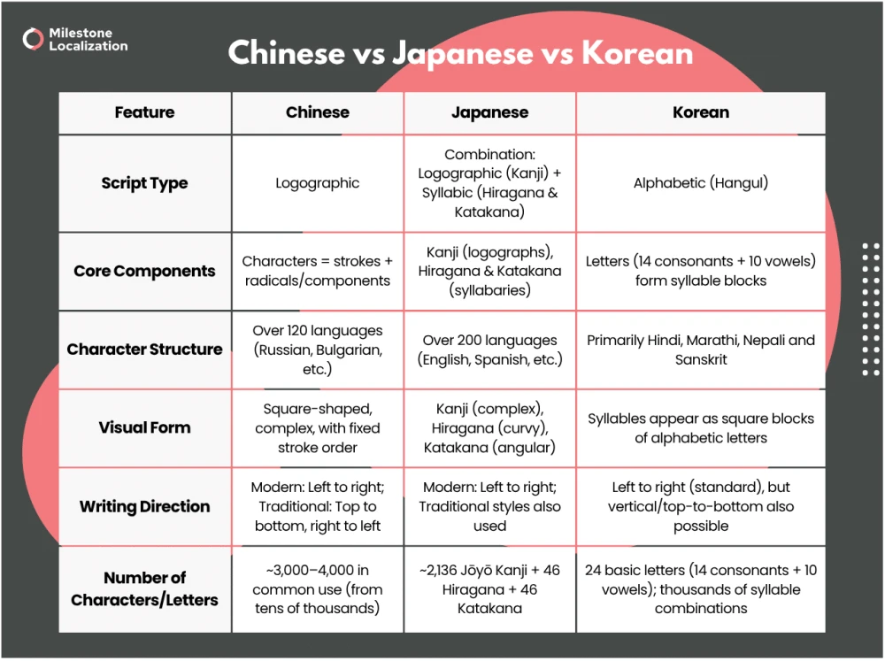 For instance, Chinese characters are square while Japanese are rounder and curvier. Korean characters feature a lot of circular shapes, which are not present in the writing systems of the other two languages.