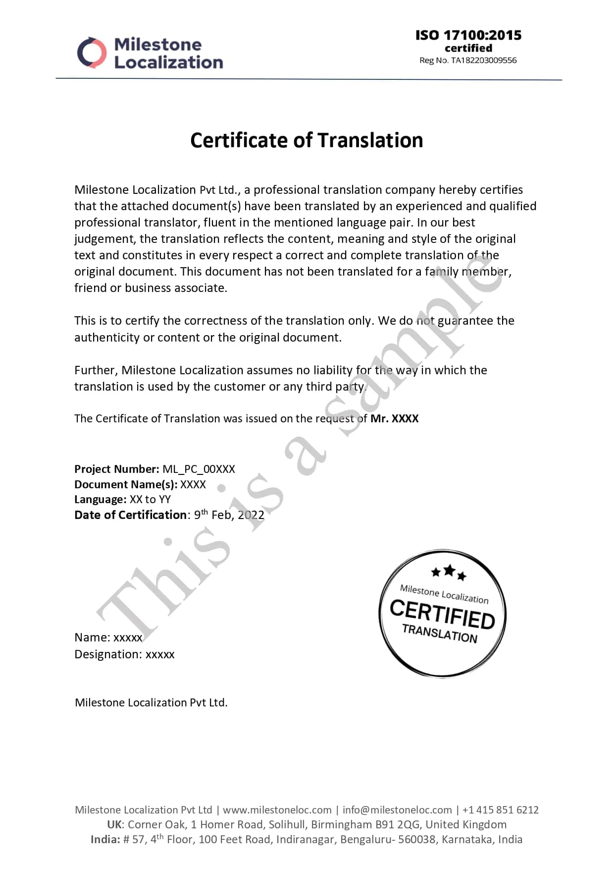 Yes, we can provide a translation certificate upon your request. These certificates can be used for all official purposes and will have our company logo, seal and signature.