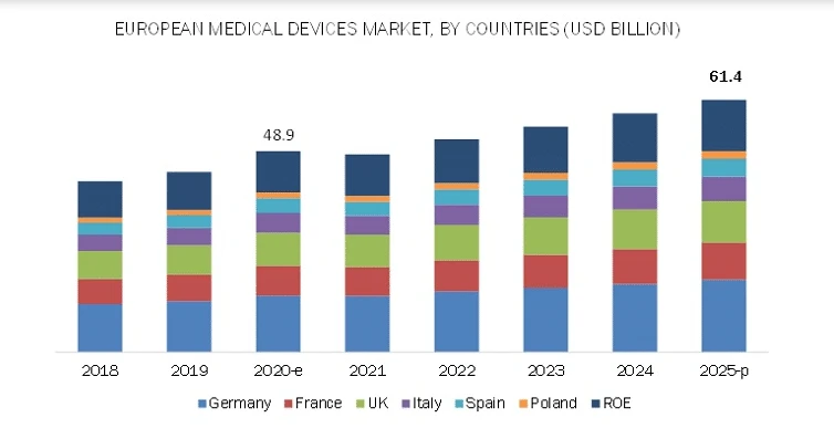 Germany is Europe’s largest medical device market, supported by a strong healthcare system and widespread use of advanced medical technologies. In 2024, the market was valued at USD 37.7 billion and is expected to grow to USD 41.39 billion by 2032, at a CAGR of 3.47%.