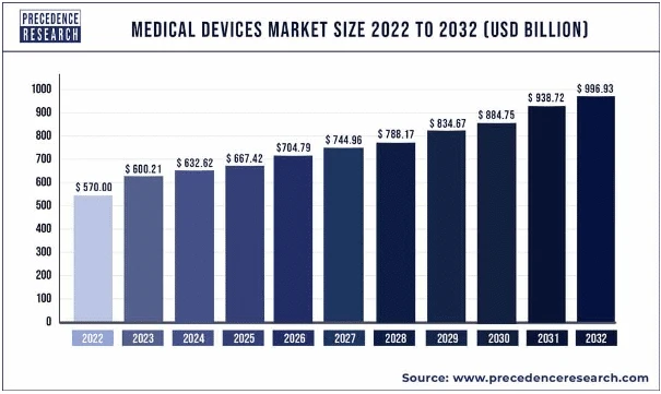According to reports, the medical device market is expected to make a revenue of $595 billion in 2024, with projections suggesting that it will reach $886.80 billion by 2032.