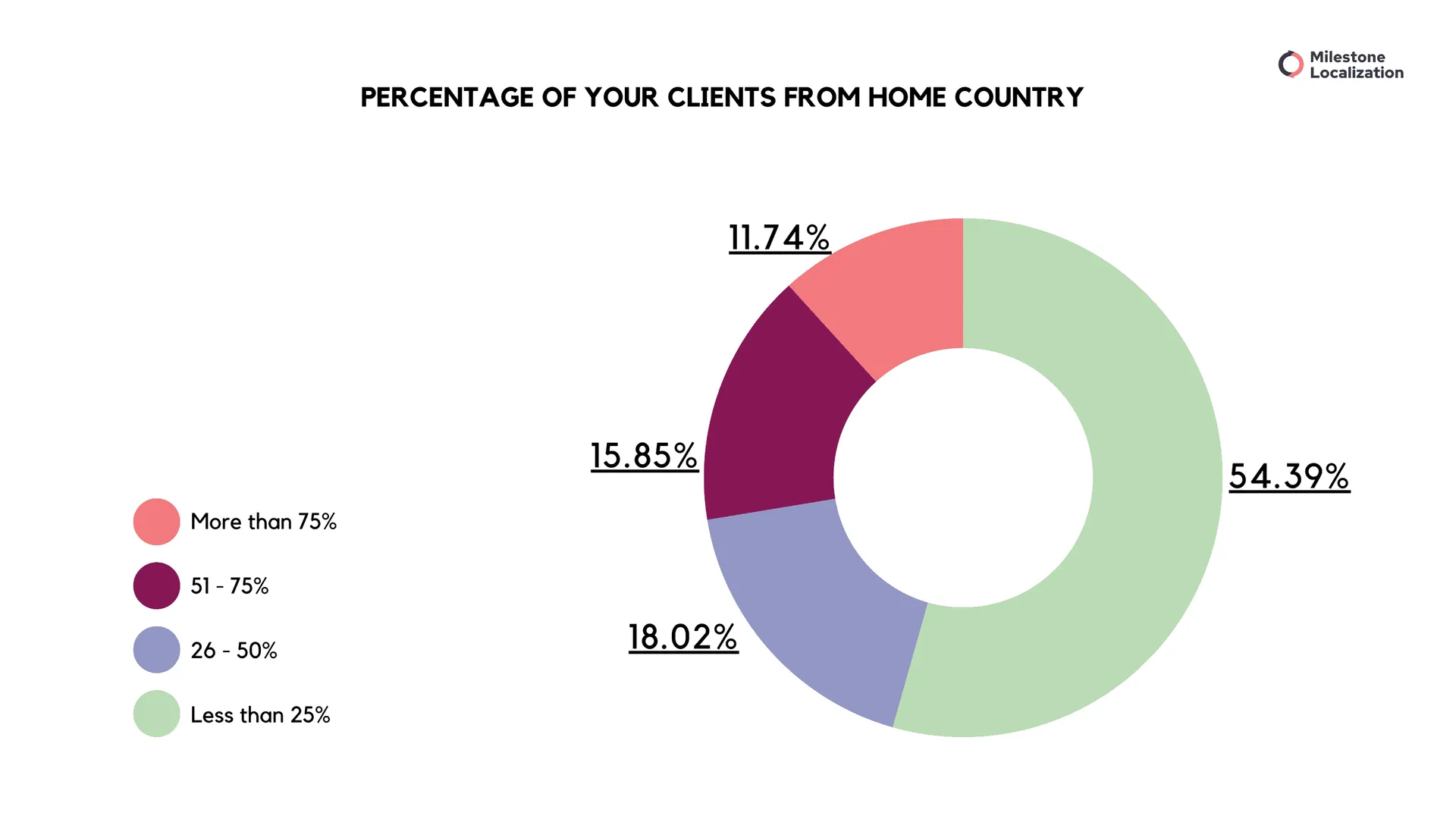 Since the demand for translation and localization services is global, freelancers work with clients from their home country as well as international clients. 54.39% say that less than 25% of their clients are from their home country.
