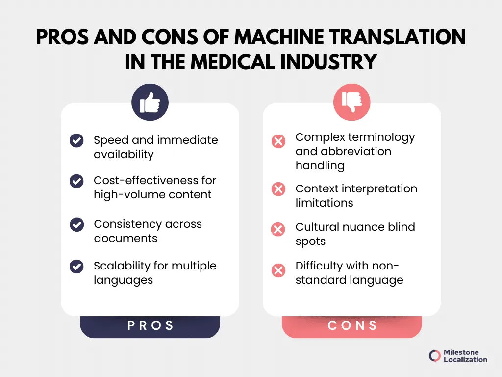 Machine translation (MT) offers immediate availability, cost-effectiveness for large volumes, scalability across many languages, benefiting routine or low-risk medical content.