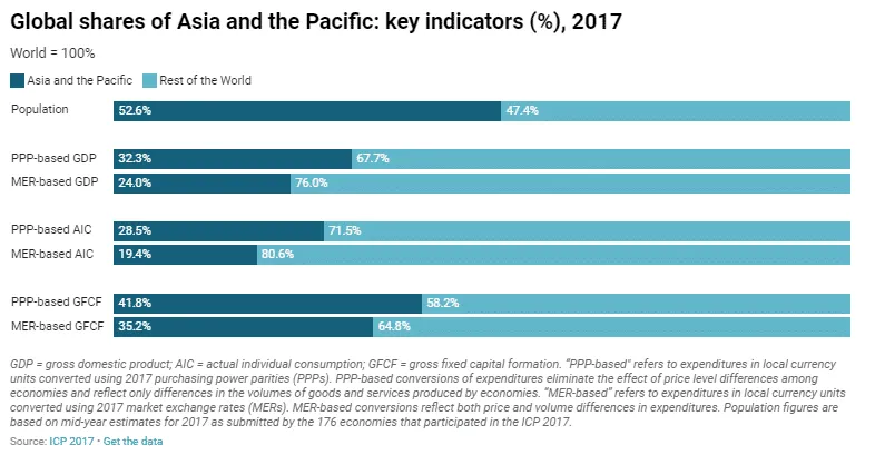 In terms of share of global PPP-based GDP, three economies in the Asia-Pacific region are among the largest in the world: China (18.8%), India (7.3%), and Indonesia (2.49%) ranking first, third, and seventh, respectively in the world.