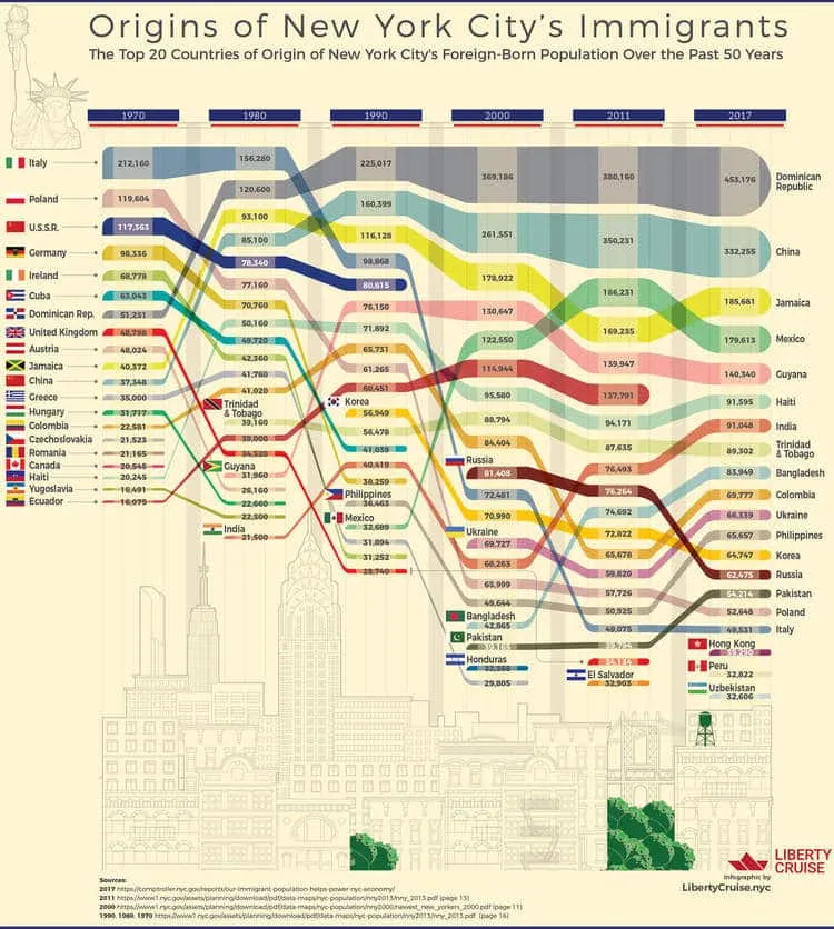 After World War II, and especially following the Immigration and Nationality Act of 1965, immigration patterns shifted dramatically. Instead of Europeans, new arrivals came mostly from Latin America, Asia, and the Caribbean. These communities brought new languages, cuisines, religions, and customs, enriching New York’s cultural mix. They introduced new languages, traditions, and cultural practices, enriching daily life across both New York City and upstate communities.