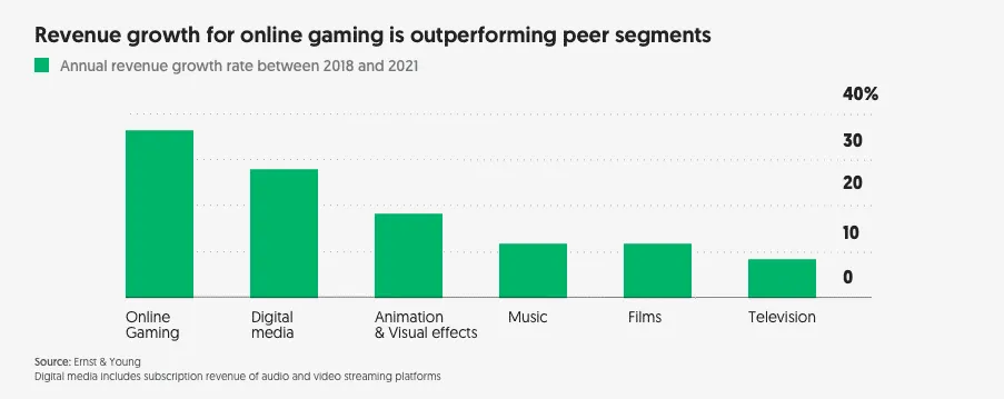 Gaming is among the fastest-growing sunrise industries in India, with a 40% growth in 2019–2020. In 2021 the industry generated USD 1.8 billion in revenue and is expected to exceed USD 5 billion by 2025.